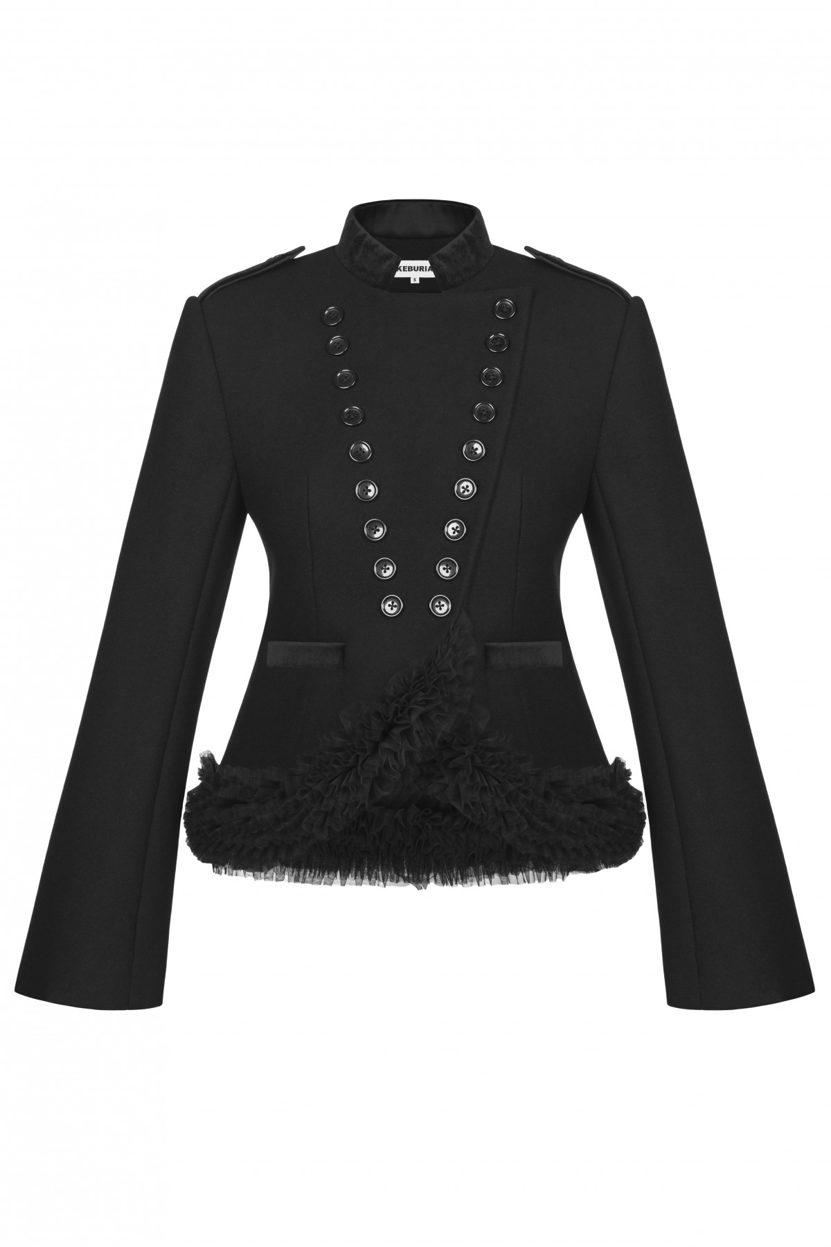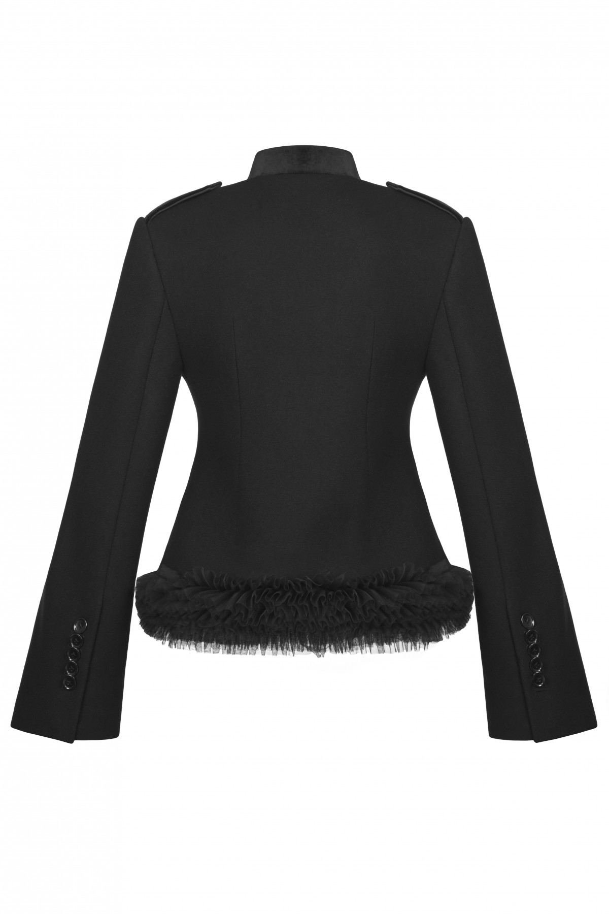 This black jacket redefines power dressing with theatrical precision. Tailored from dense wool, it features double-buttoned symmetry, epaulettes, and a cascade of tulle that softens the militaristic architecture of its design. The interplay of textures and sheer ruffles captures the essence of FW25 — strength wrapped in refined sensuality.