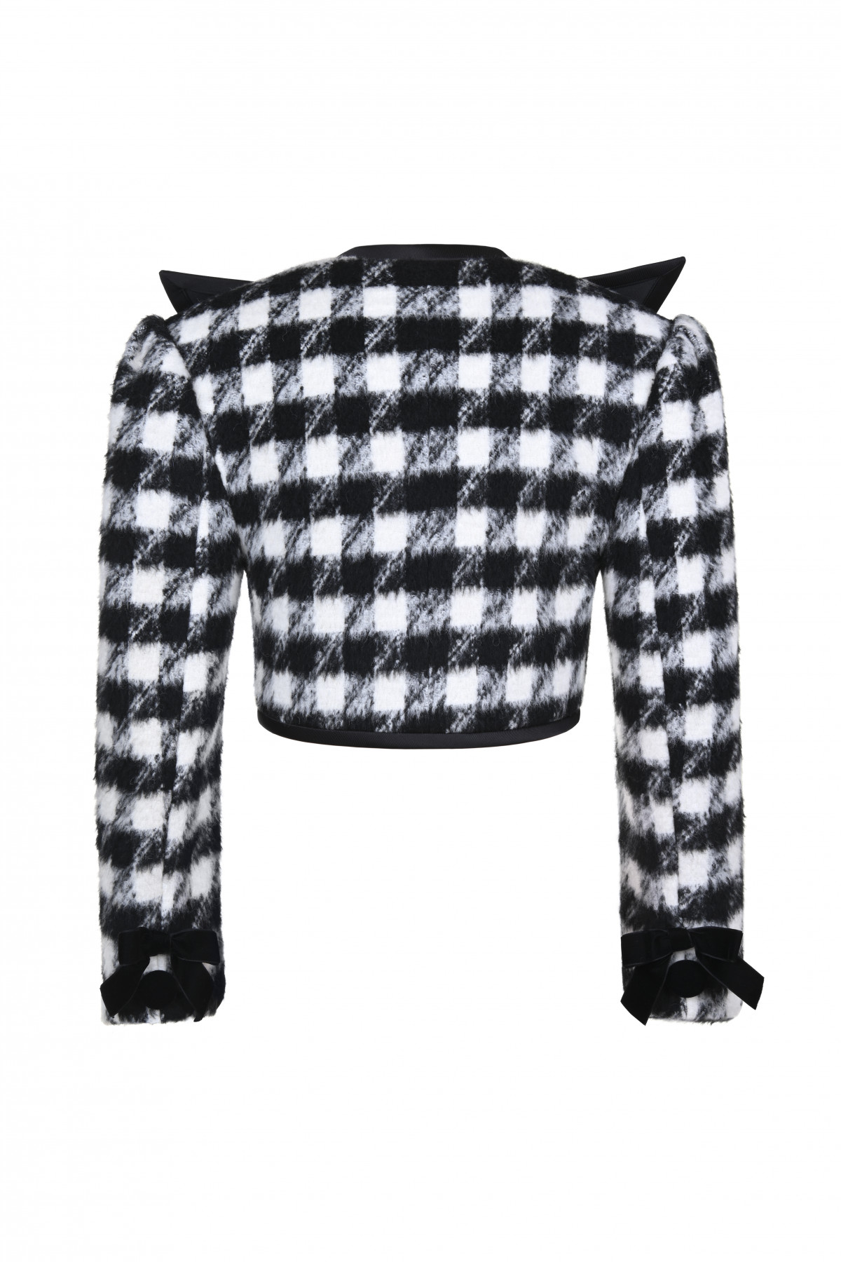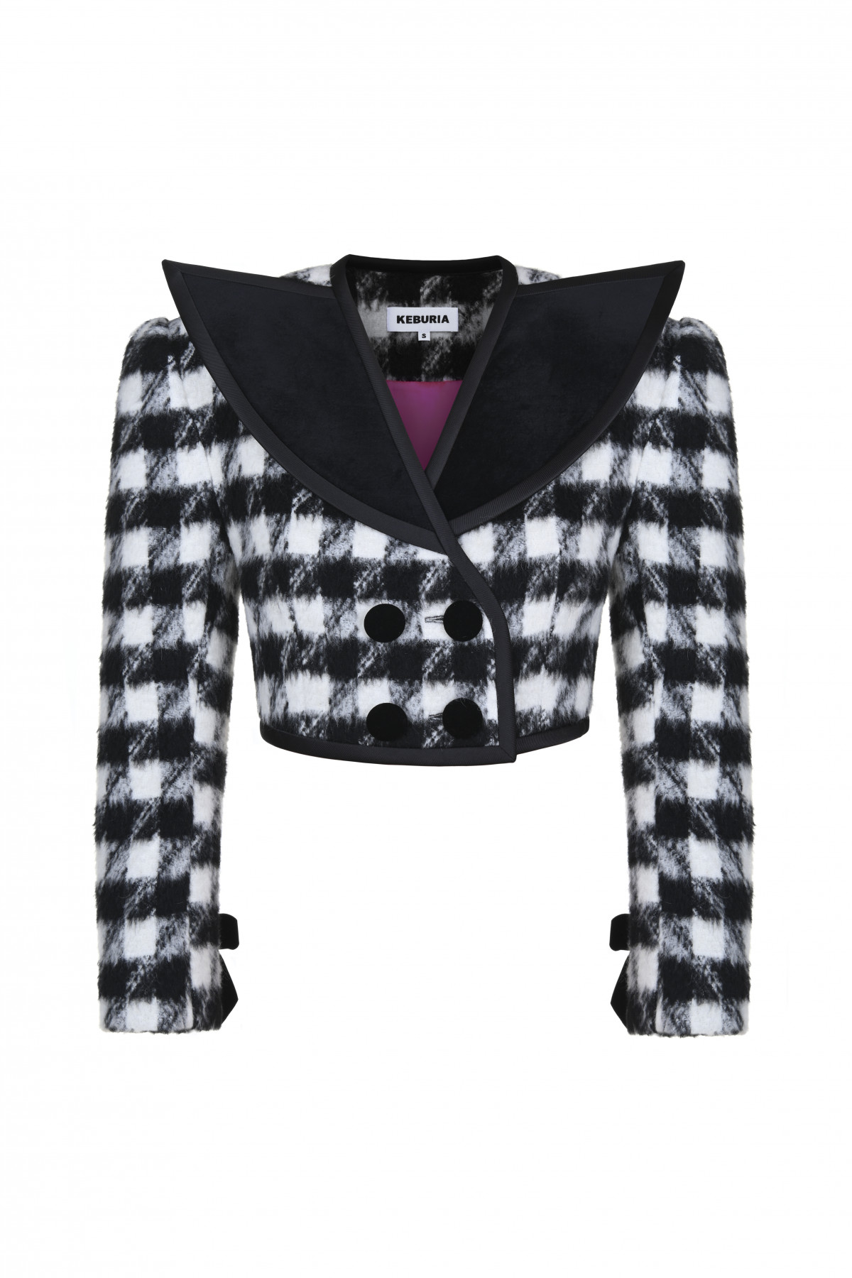 FW25 jacket reimagines the timeless black-and-white pattern through a contemporary lens. The jacket features cropped silhouette and contrasting pink lining. The oversized geometric collar creates a contrast that enhances the sharp elegance.