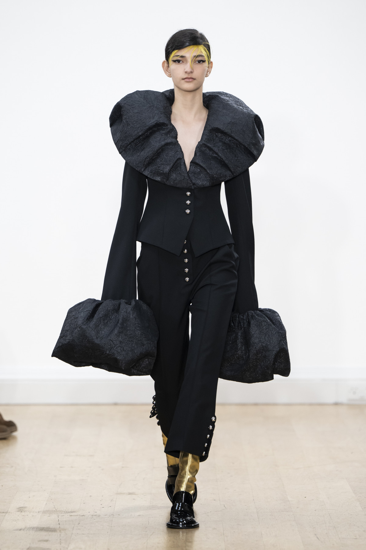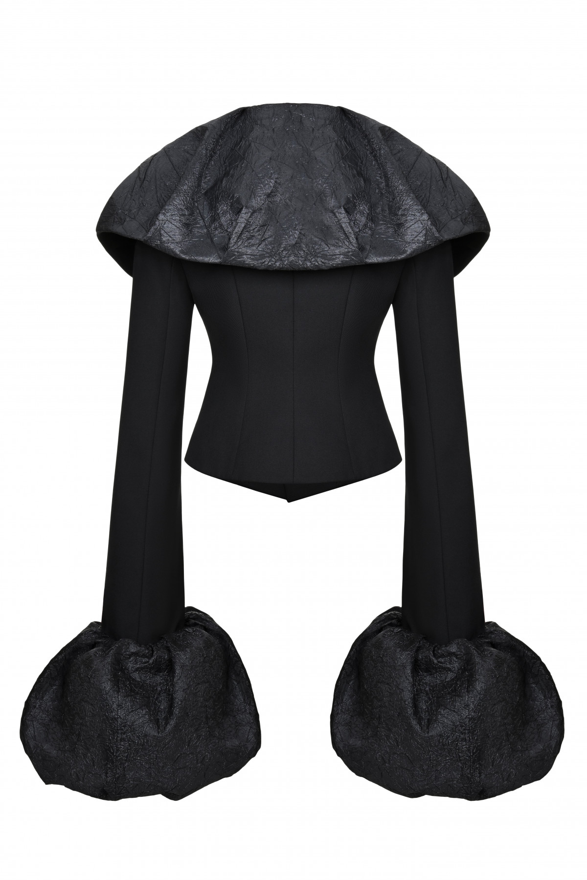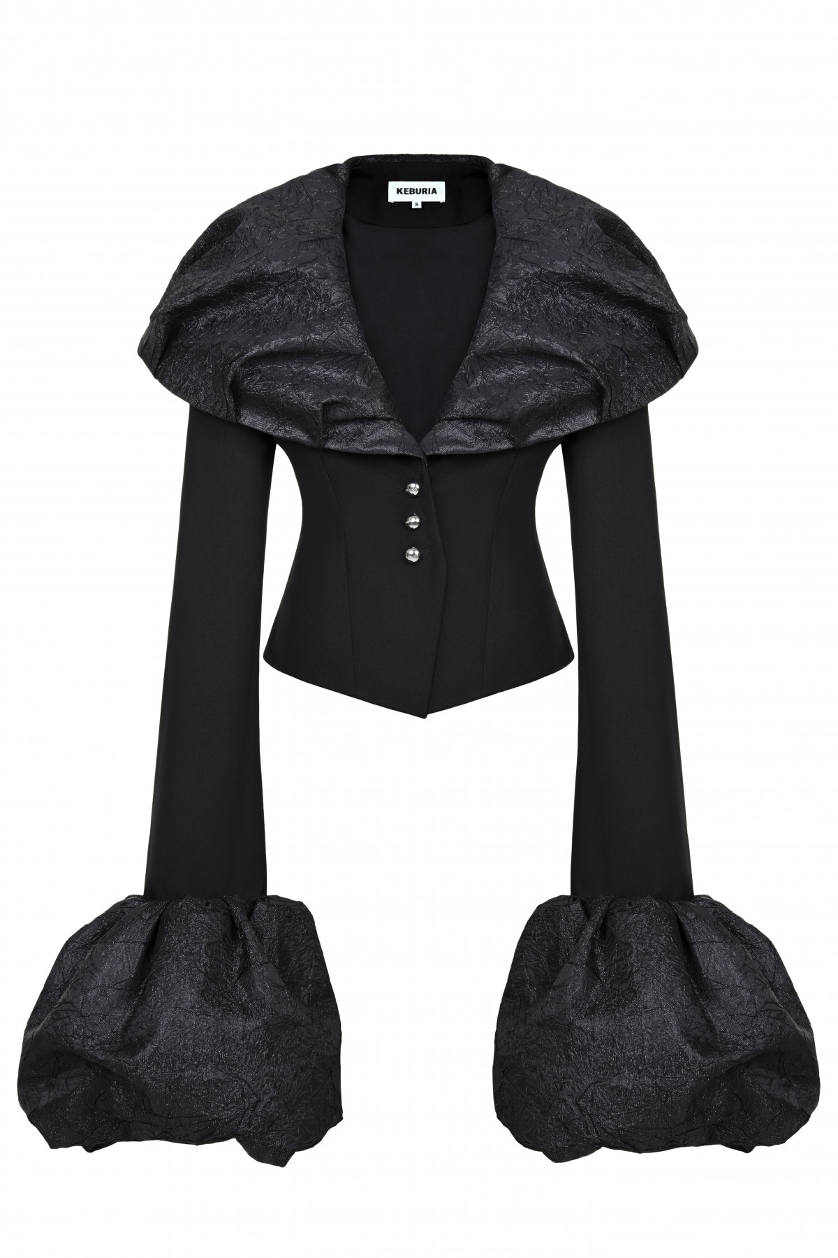 From the FW25 collection, this tailored jacket redefines classic structure through exaggerated proportions. Crafted from structured fabric, it features voluminous puffed cuffs and an oversized sculptural collar that frames the neckline dramatically. The fitted waist and metal button closure balance boldness with precision, evoking Keburia’s distinctive mix of power and playfulness.