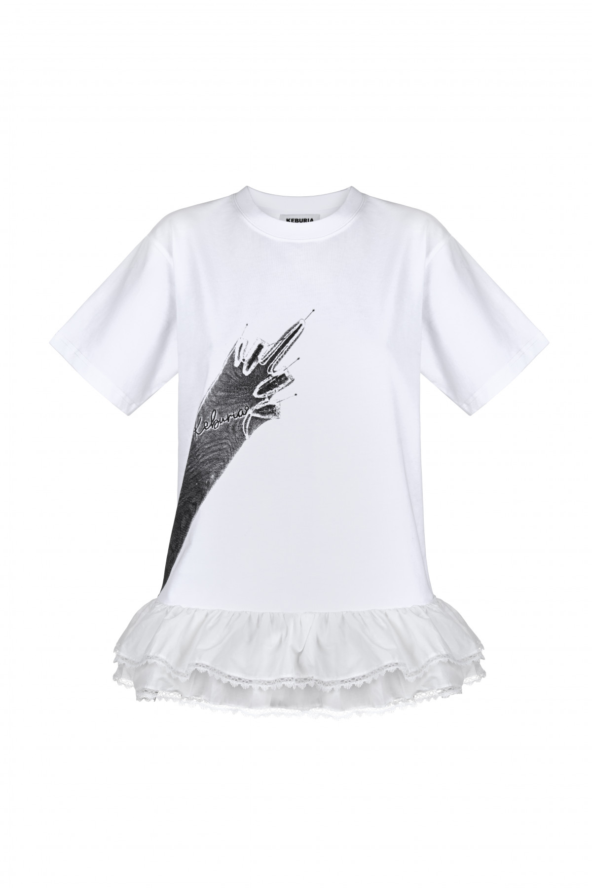 From the FW25 collection, this white cotton T-shirt blends minimalism with artistic detail. Featuring a signature glove print motif and tonal lace-trimmed ruffled hem, it redefines everyday wear with a playful yet elegant twist. Its clean silhouette and sculptural texture encapsulate Keburia’s offbeat femininity and contemporary aesthetic.