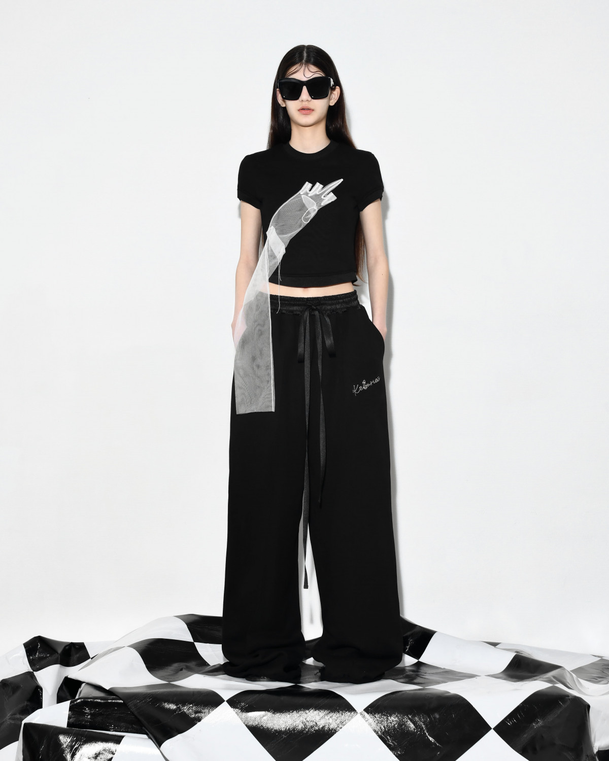 From the FW25 collection, these black cotton-jersey sweatpants blend comfort with conceptual detailing. The relaxed silhouette features an elasticated waistband with adjustable ties and side pockets. A statement glove appliqué adorns the back.