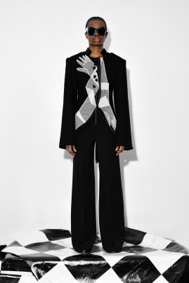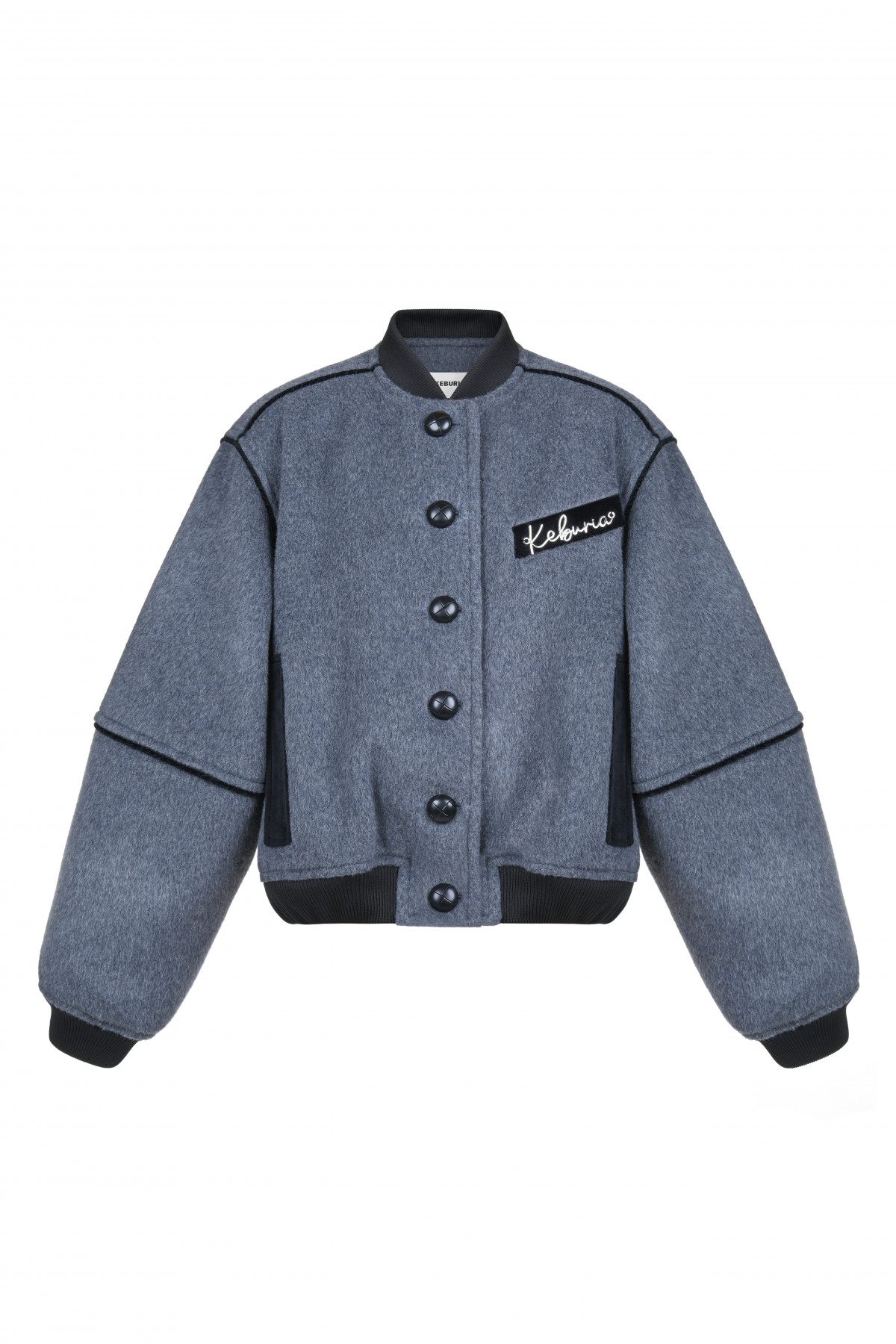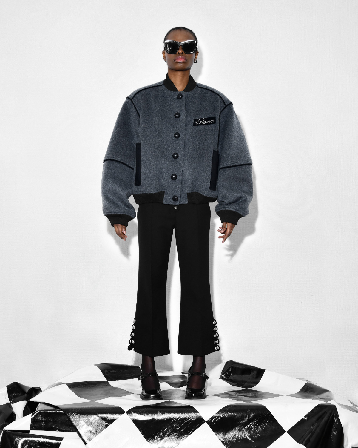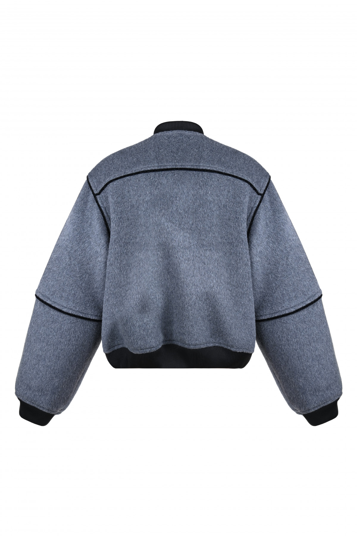 From the FW25 collection, this structured bomber jacket is crafted from soft wool in a deep steel-grey hue. Designed with an oversized fit, it merges utility with volume. It features contrasting piping and tonal ribbed trims, sculptural proportion, and a metal logo patch.