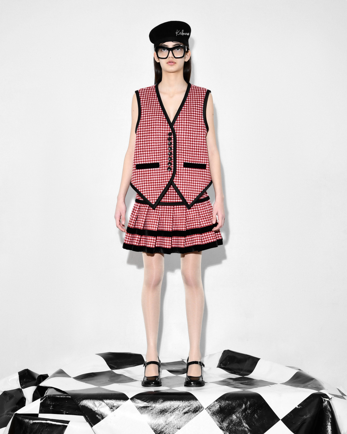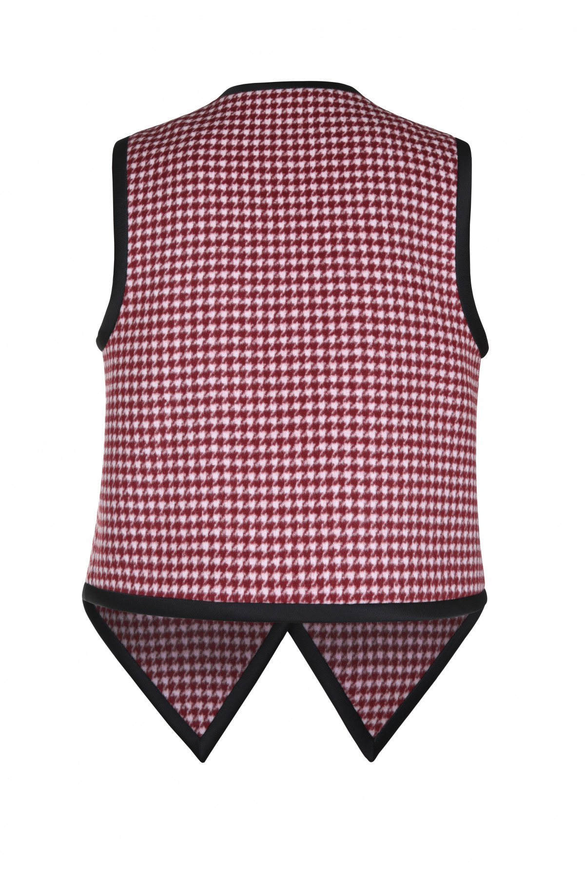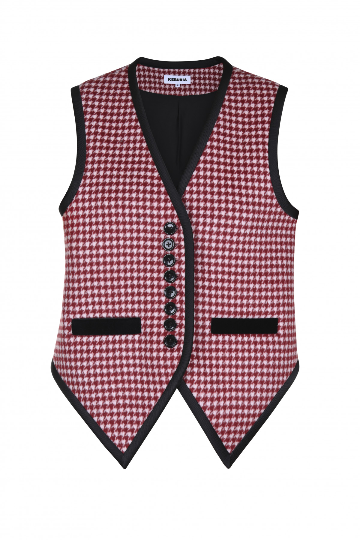 From the FW25 collection, this tailored wool vest redefines classic menswear codes with Keburia’s signature playful twist. The sharp houndstooth pattern in red and white is framed by contrasting black trims. It is designed with a button-down front and welt pockets.