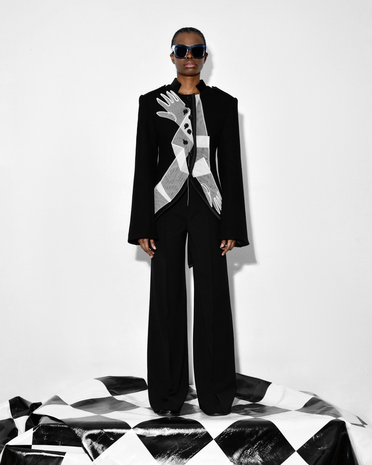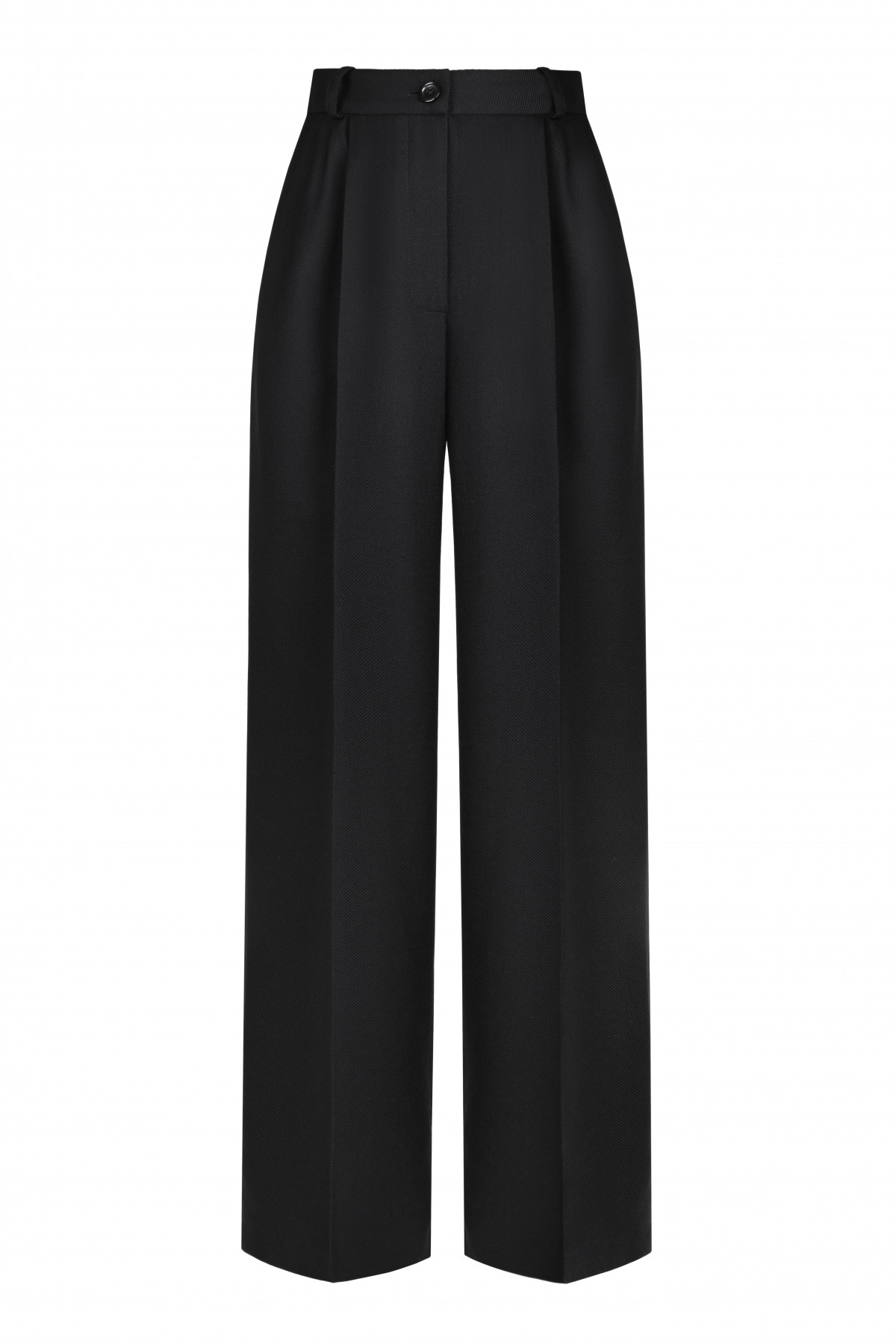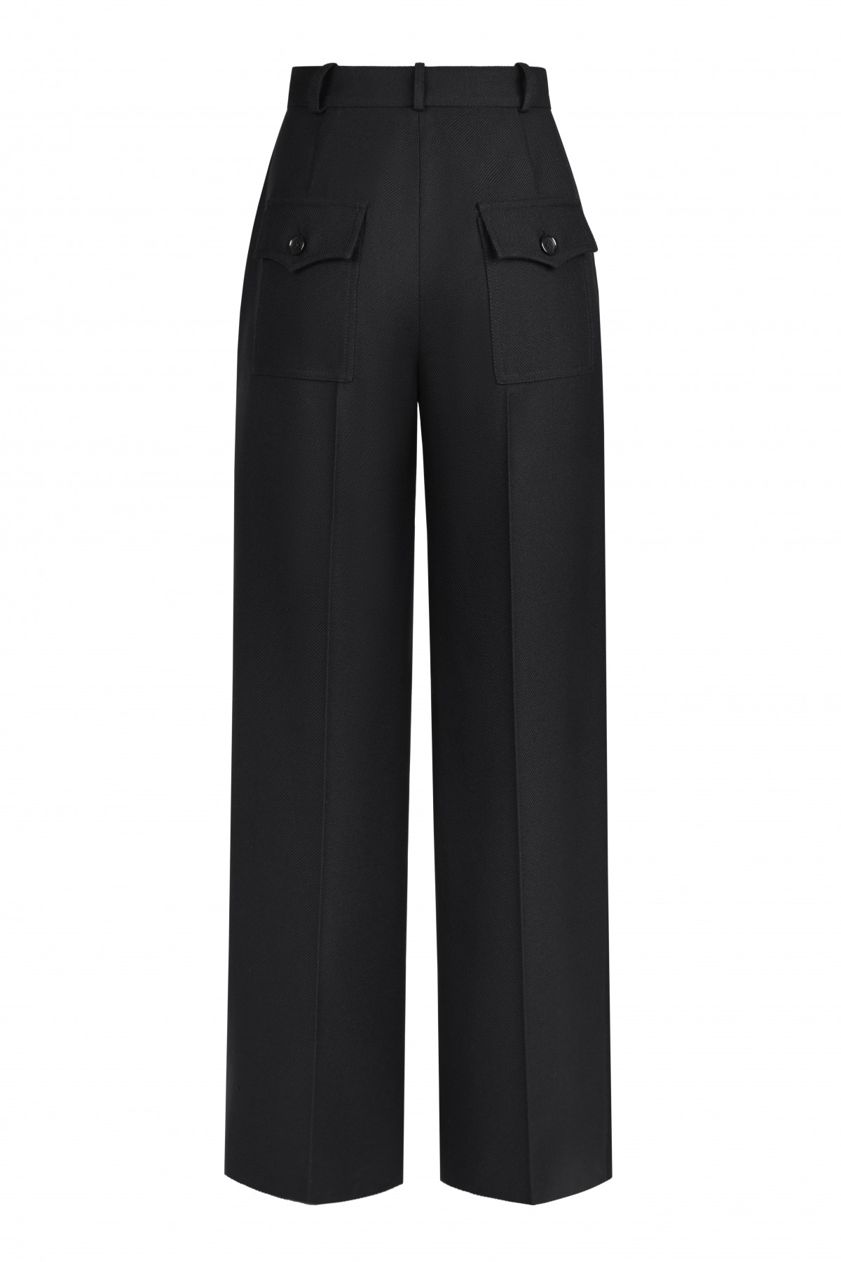 From the FW25 collection, these black straight-leg pants are crafted from wool-blend fabric, they feature a high-rise waist, sharp front pleats, and pressed creases that elongate the silhouette. Back flap pockets add a utilitarian touch.