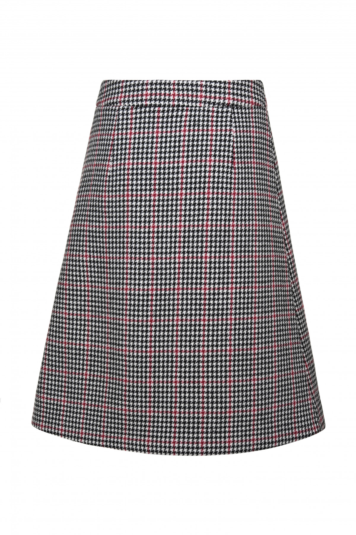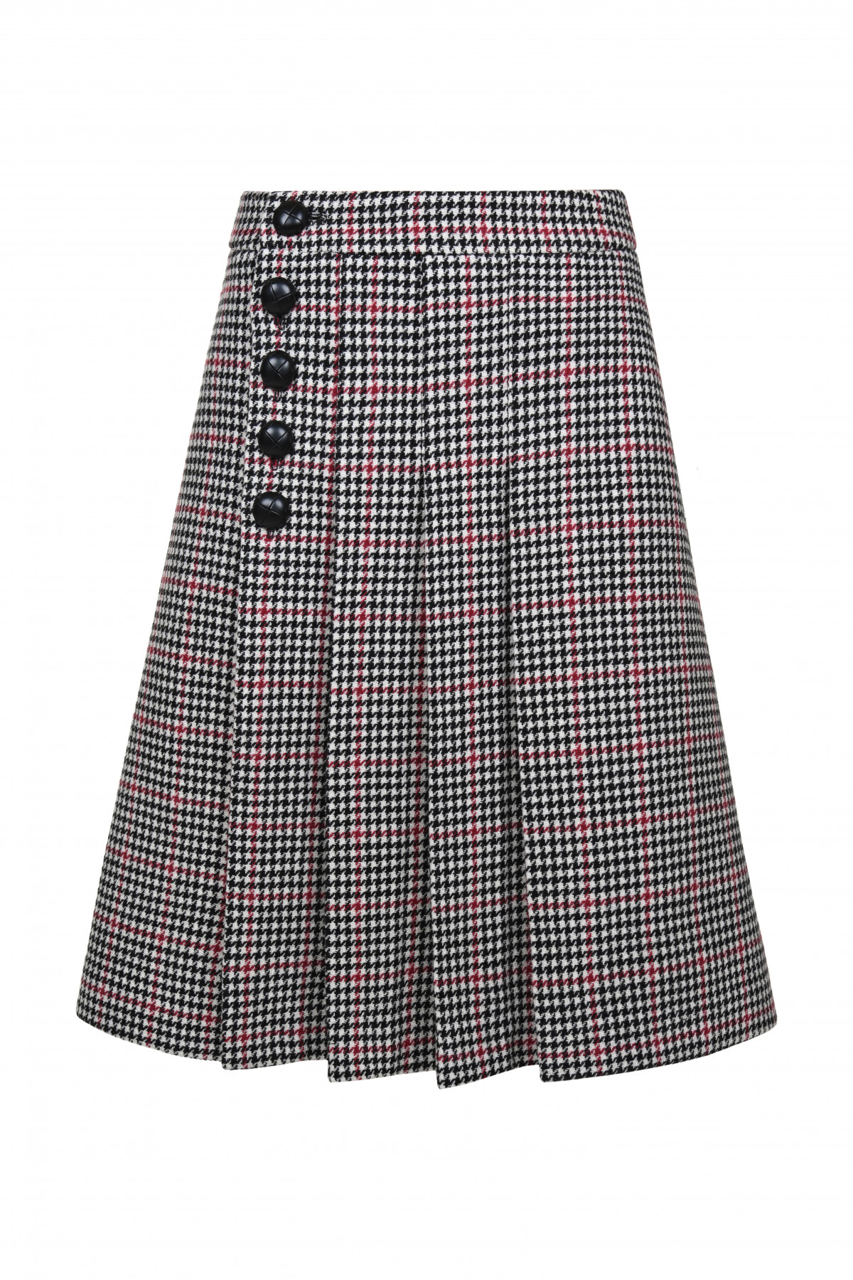 From the FW25 collection, this pleated midi skirt features a structured A-line silhouette cut from houndstooth wool with a subtle red accent. The front fastening with tonal black buttons adds a tailored twist to its classic pattern. Designed to sit high on the waist, it offers a refined yet playful interpretation of timeless heritage dressing.