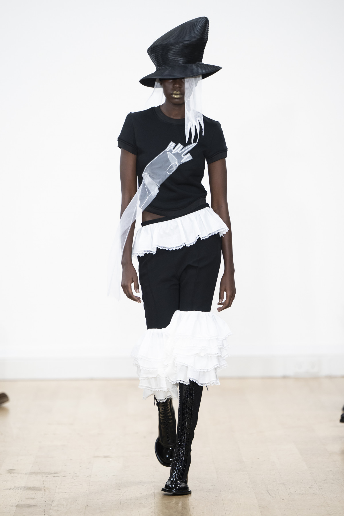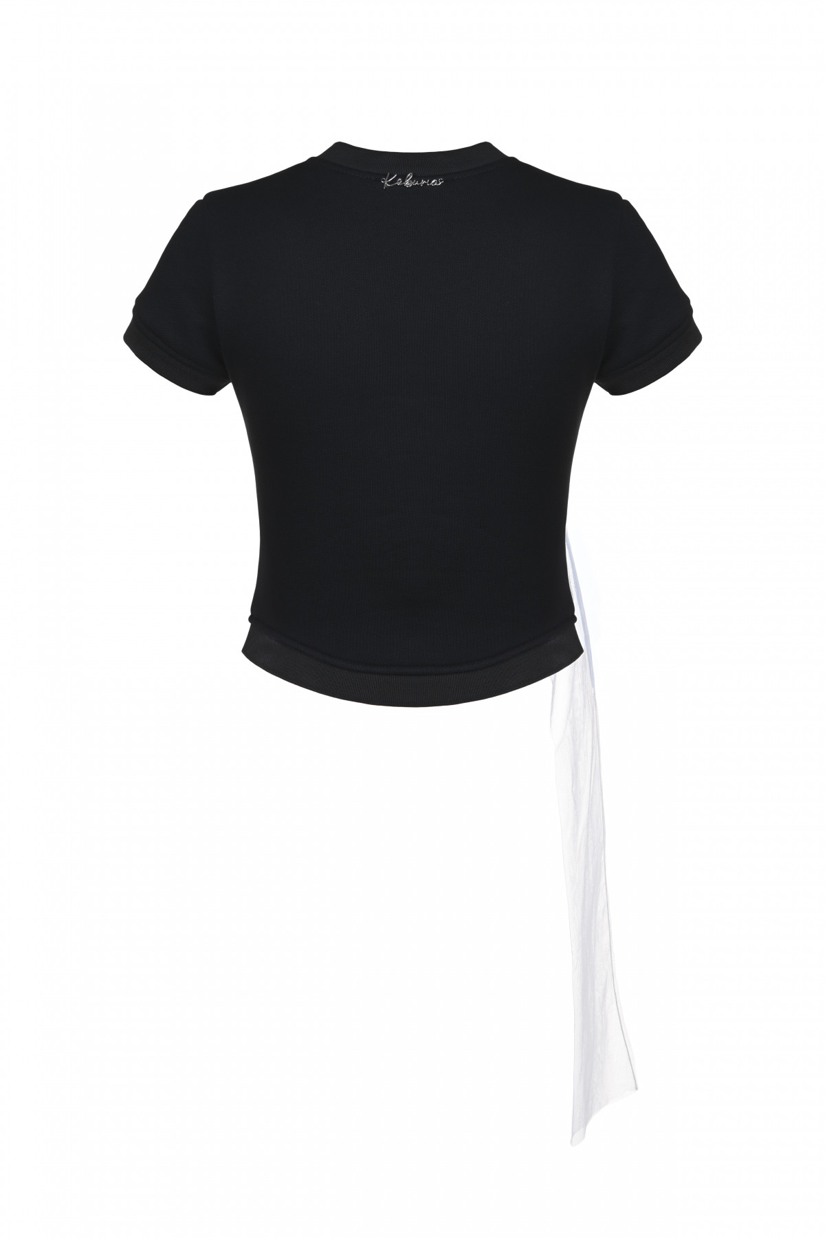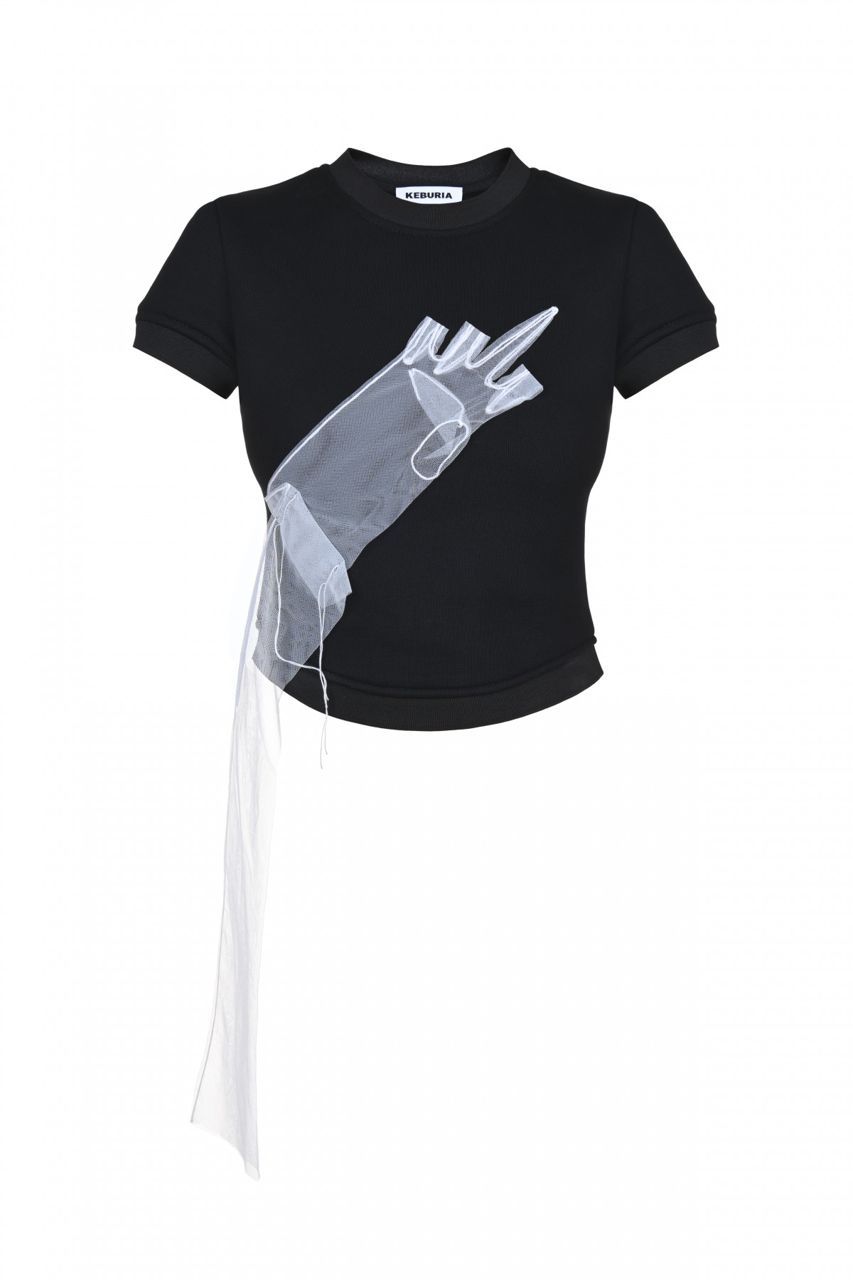 Crafted from soft cotton-jersey, this fitted black tee from the FW25 collection is designed with a delicate sheer tulle glove appliqué that drapes asymmetrically across the front. Finished with subtle logo embroidery on the back neckline, it captures the essence of modern romanticism with a playful twist.
