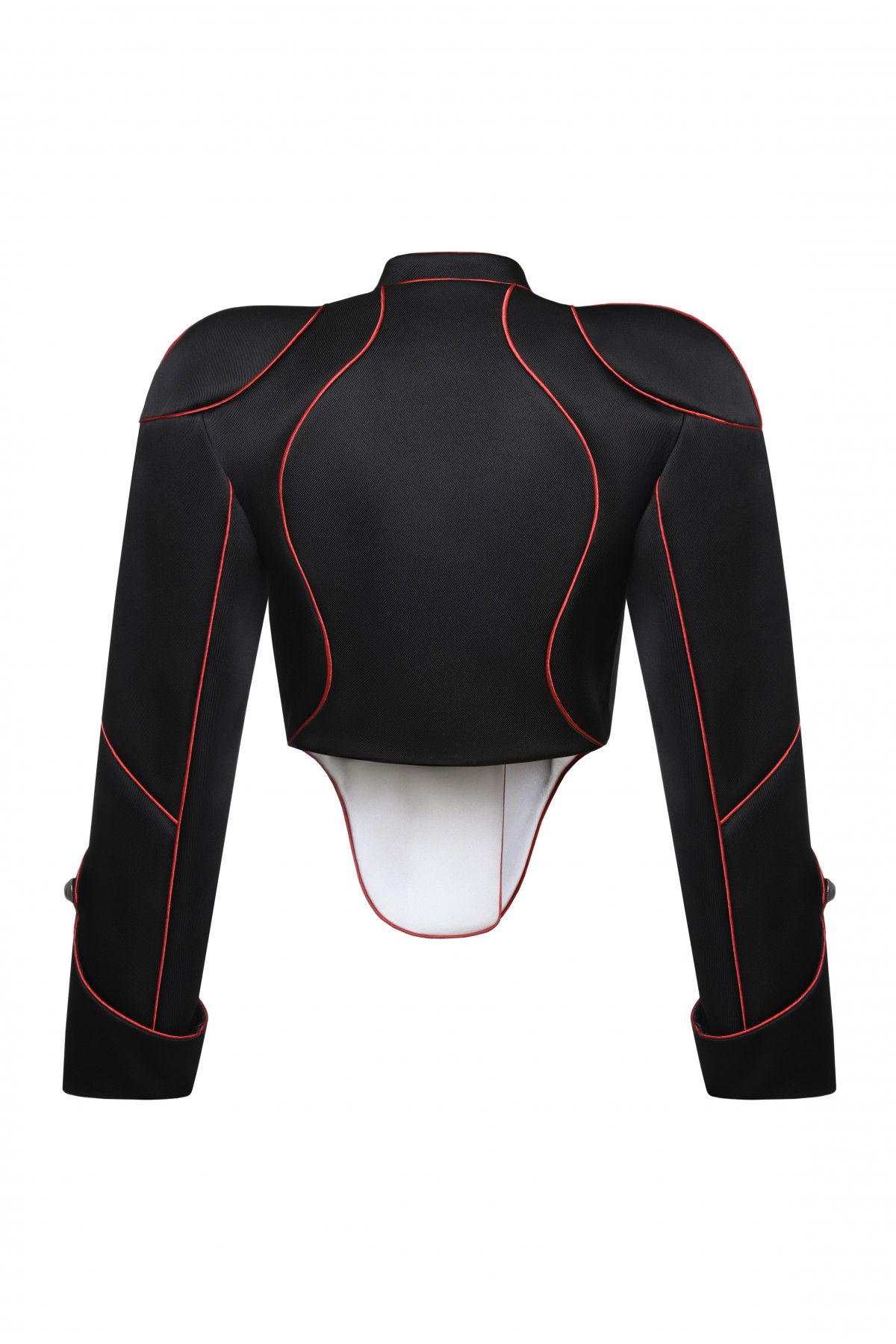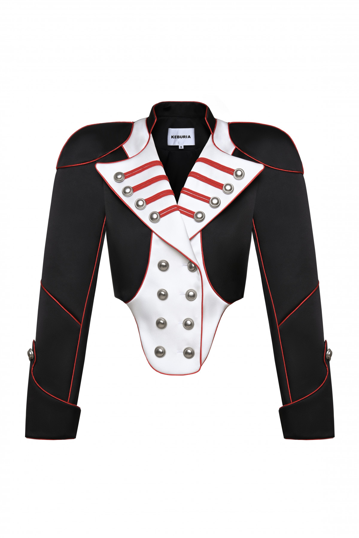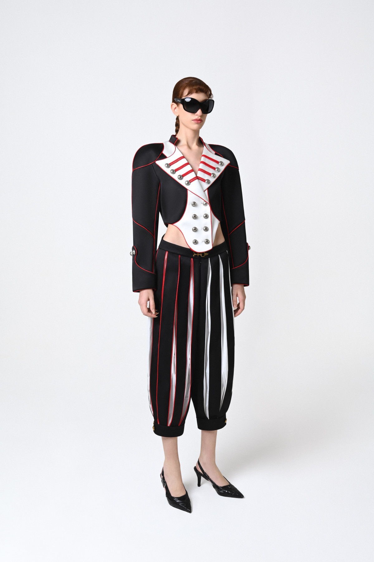 from the Spring/Summer 2026 Collection, this cropped jacket is defined by a sharp, sculpted silhouette and a double-breasted front. Contrasting panels and red piping outline the structured form, while metallic buttons reference military and ceremonial uniforms, reinterpreted with a bold, contemporary edge.