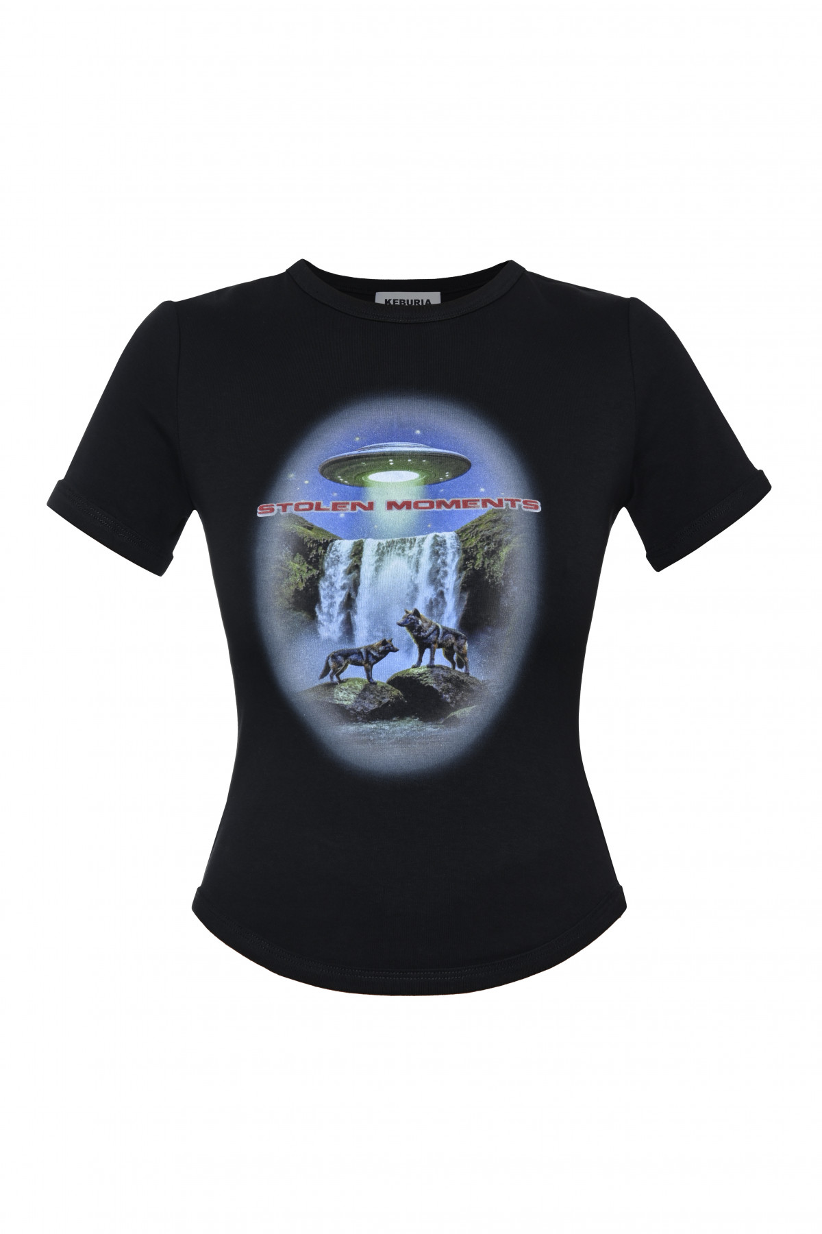 from the Spring/Summer 2026 Collection, the Stolen Moments Tee features a fitted silhouette and a graphic print at the center front. The black base enhances the contrast of the artwork, creating a focused composition.