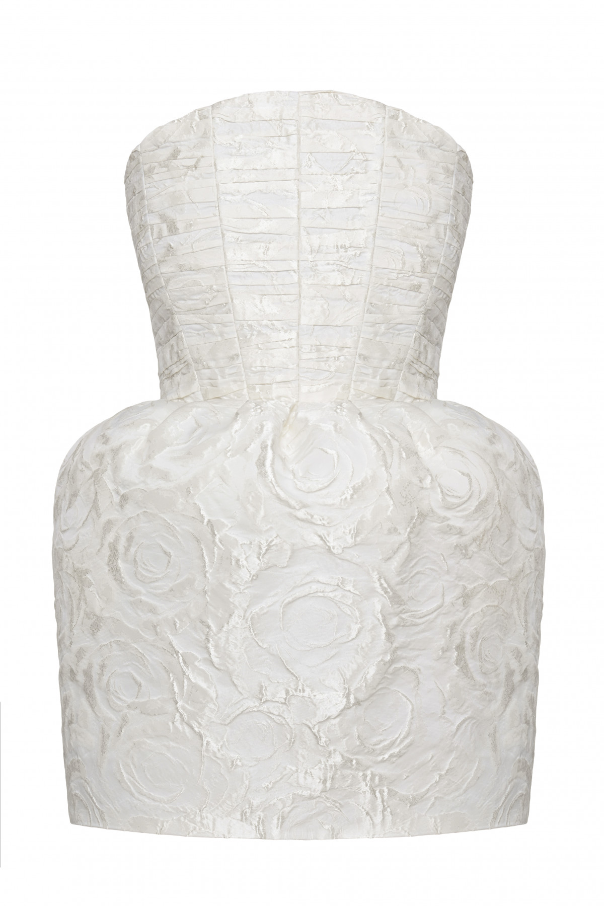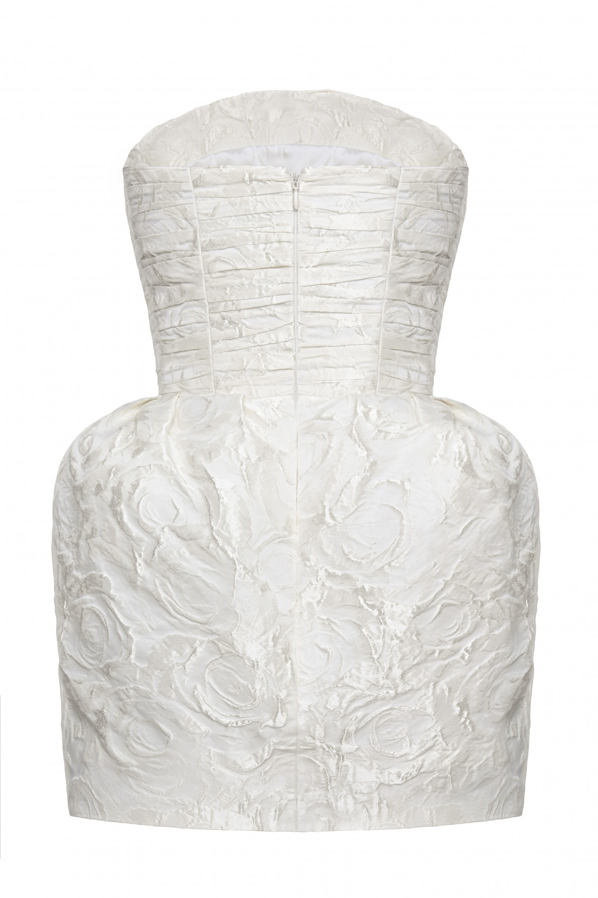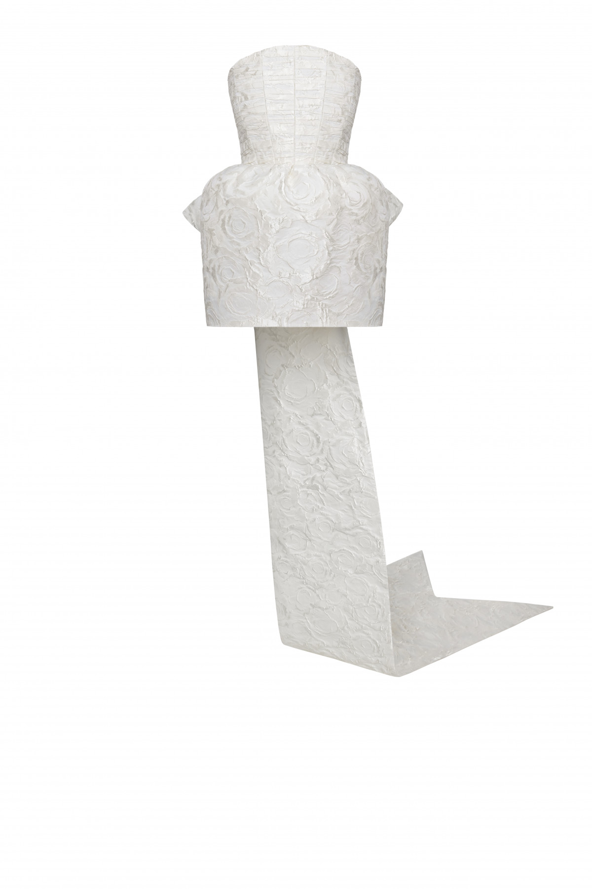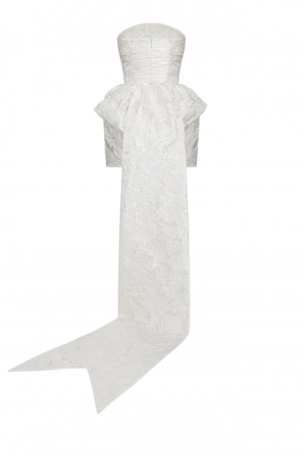 from the Spring/Summer 2026 Collection, the Bachelorette Jacquard Dress is crafted with a structured strapless corset bodice and a sculptural silhouette. The textured jacquard fabric features raised floral motifs, adding depth and dimension to the pearl-white surface. A dramatic elongated removable panel extends from the back, introducing movement and an architectural finish.