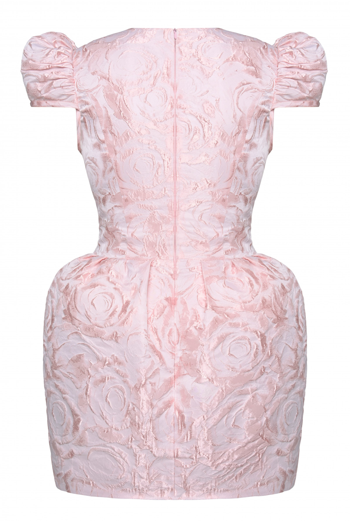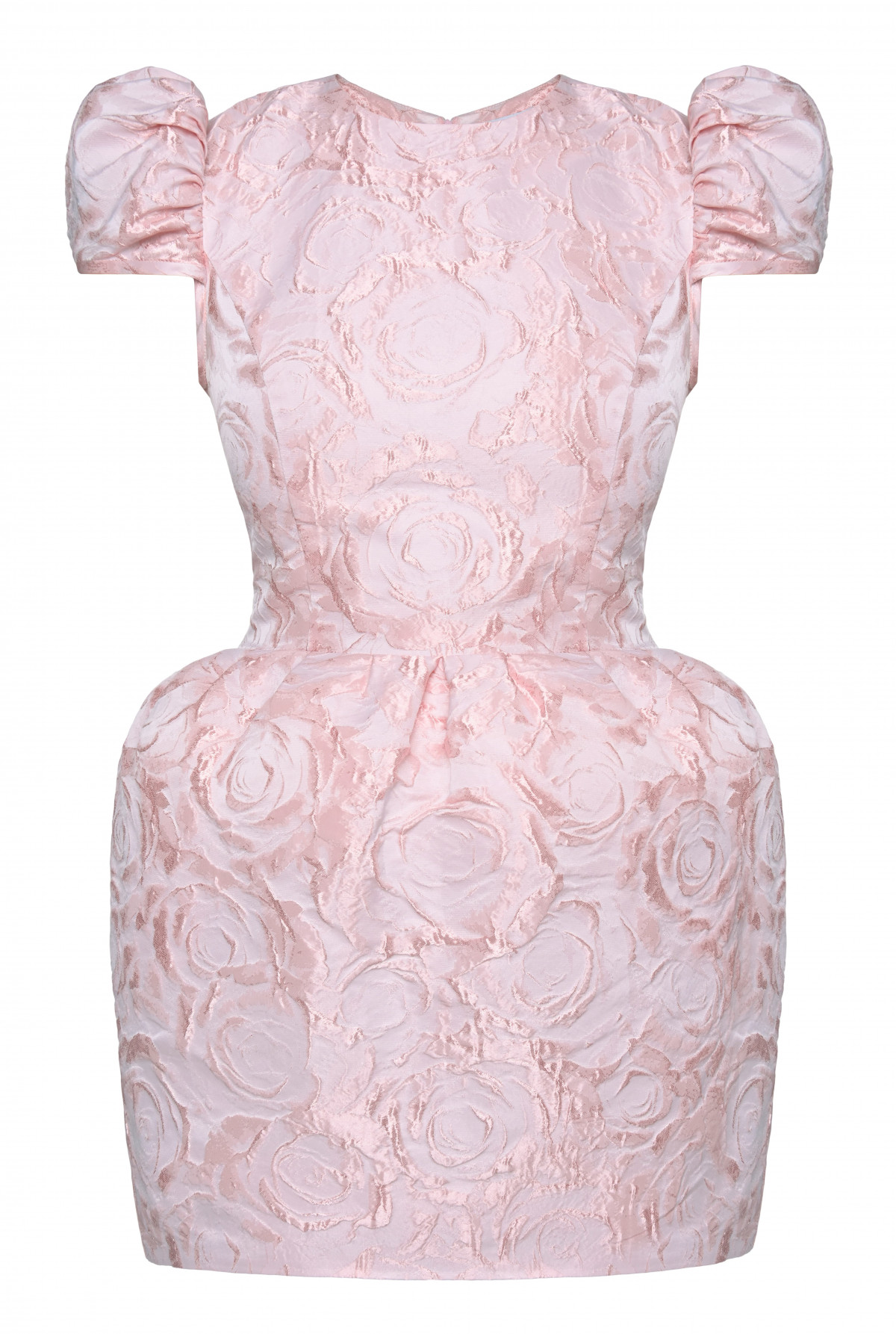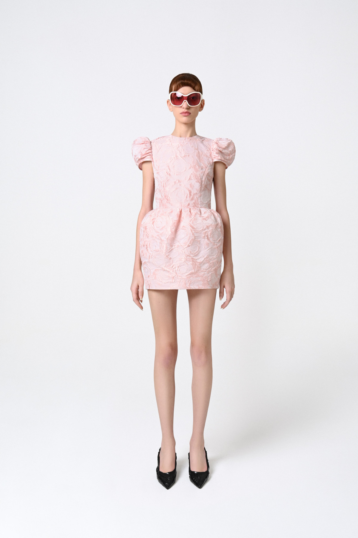 from the Spring/Summer 2026 Collection, the Amour Jacquard Mini Dress is crafted from sculptural jacquard fabric with a soft rose-inspired texture. The fitted bodice defines the waist, while the subtly structured mini skirt enhances the silhouette. Puff sleeves add volume and balance, creating a refined yet romantic statement.