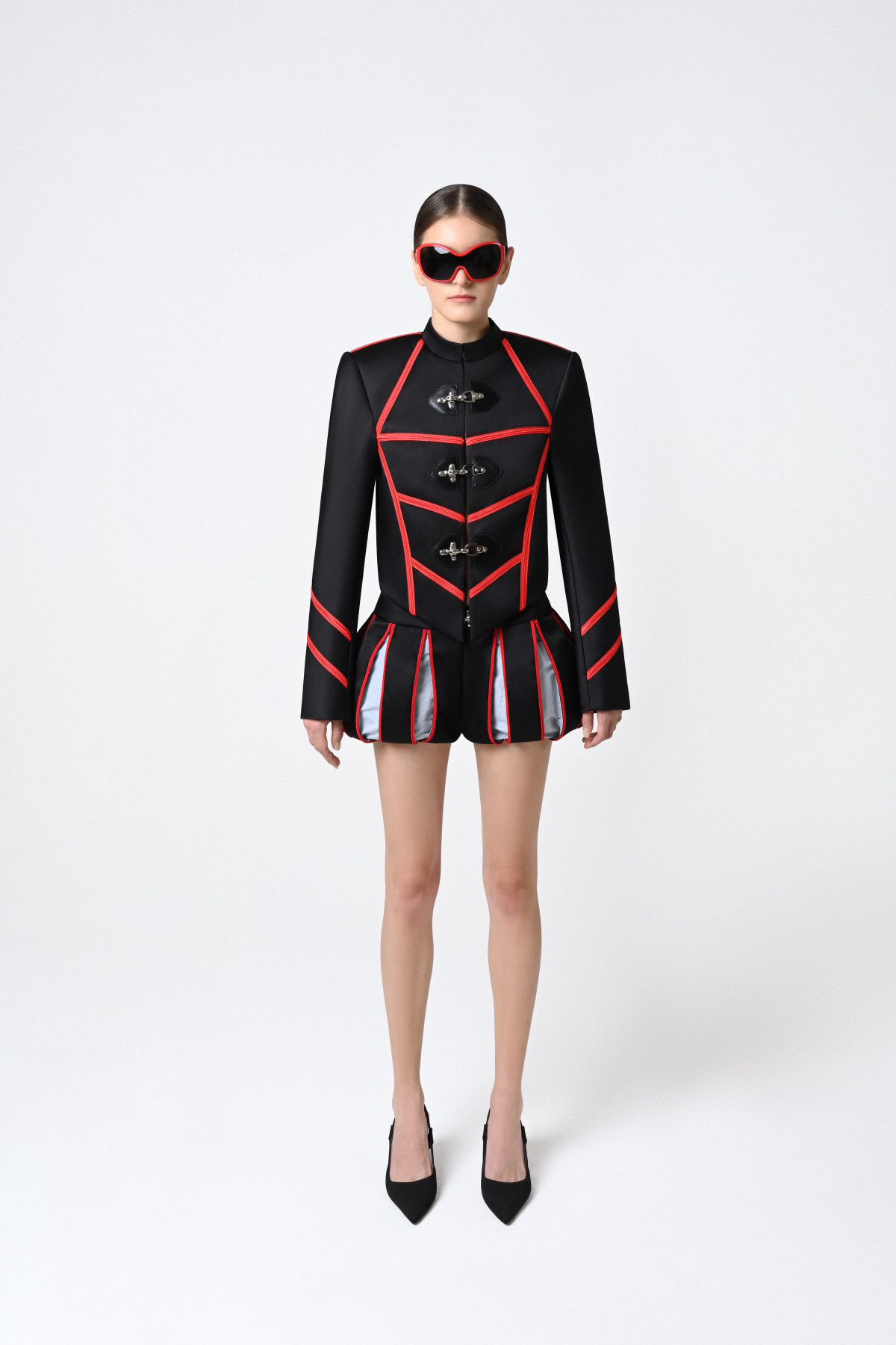 From the SS26 Collection, the balloon shorts feature a sculptural silhouette defined by structured paneling and bold contrast piping. The voluminous shape is accentuated by light blue mesh inserts framed with red lines, creating a dynamic visual rhythm. A metallic clasp detail at the waistband adds an industrial finish.