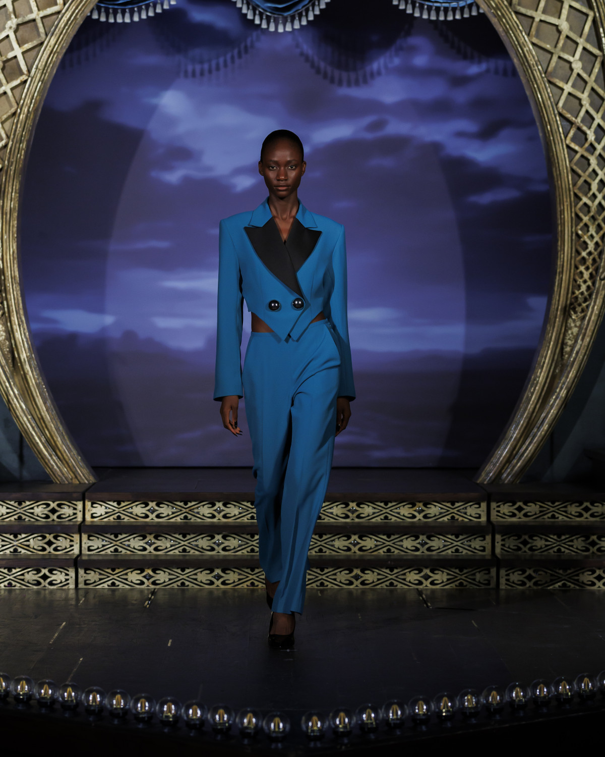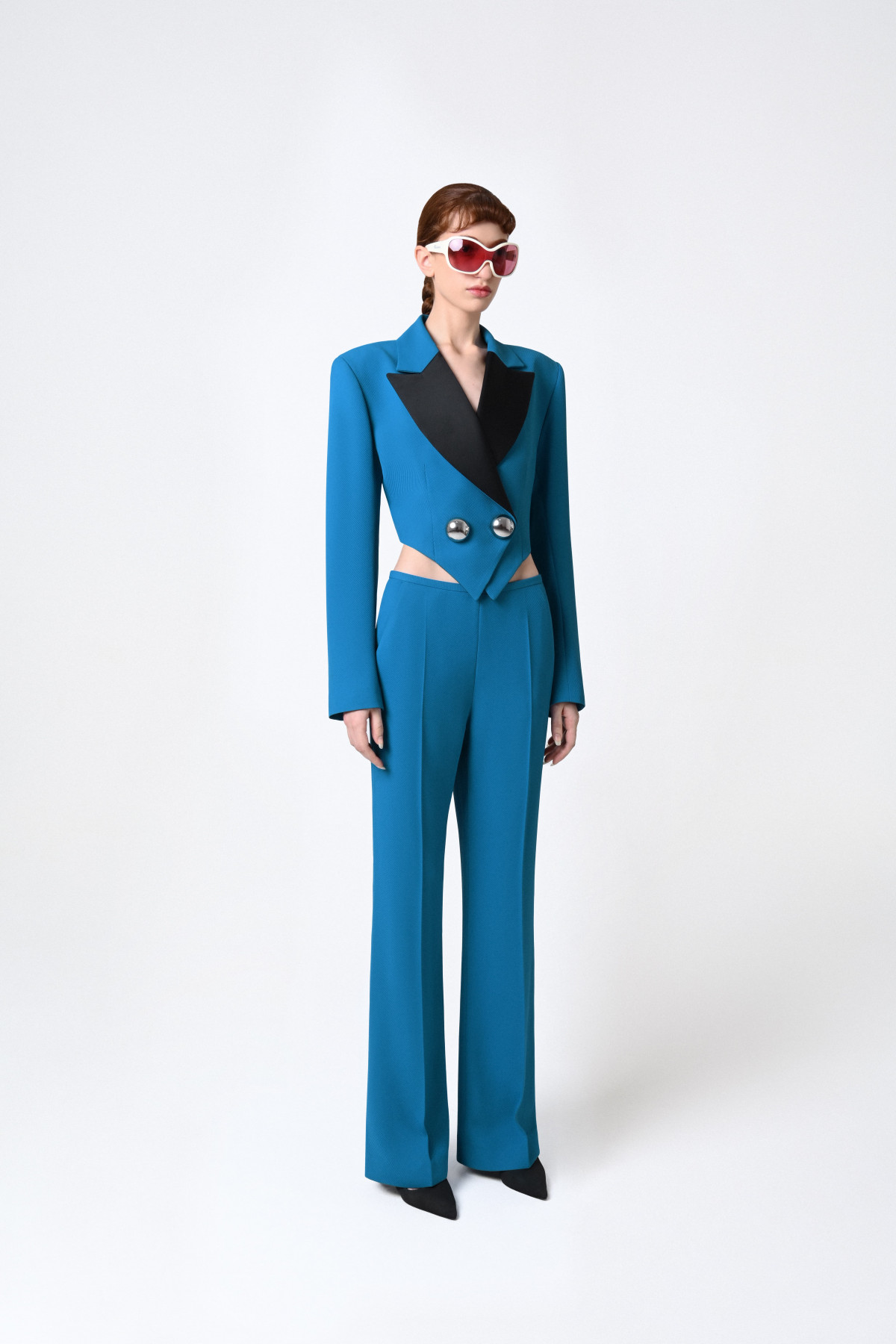 From the SS26 Collection, this cropped jacket is defined by sharp tailoring and a sculptural silhouette. Contrasting black lapels frame the neckline, while oversized metallic buttons punctuate the design. The cropped cut and clean architectural lines create a modern statement.