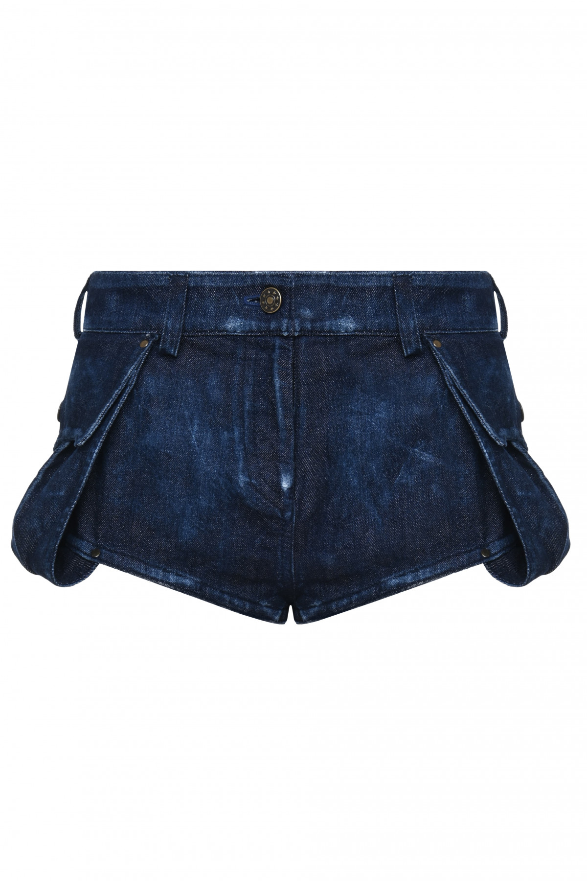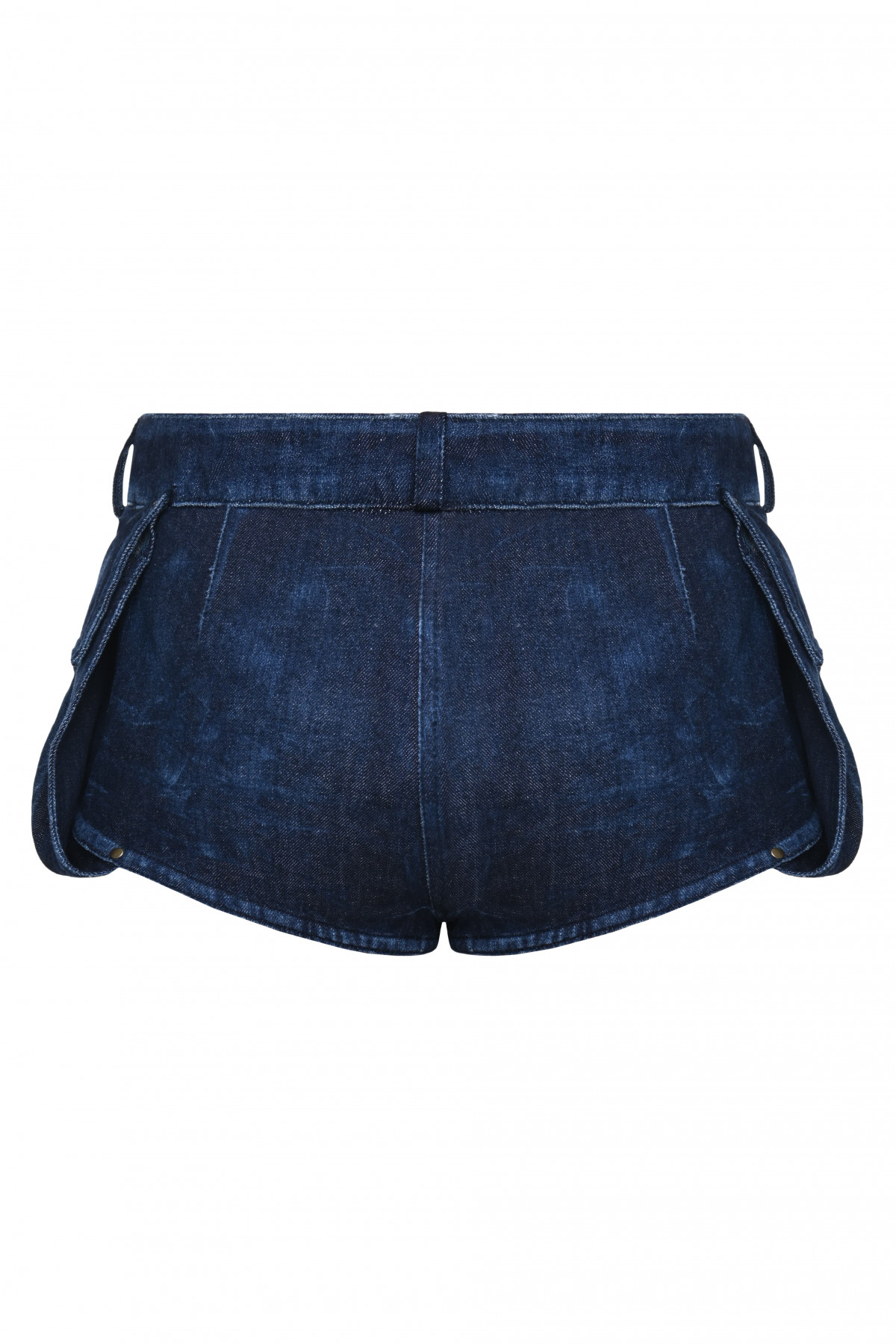 From the SS26 Collection, these handwashed denim shorts combine classic denim craftsmanship with a bold silhouette. The fitted waistline contrasts with exaggerated side pockets, creating a distinctive rodeo-inspired form. The handwashed finish enhances the depth and character of the dark blue denim.