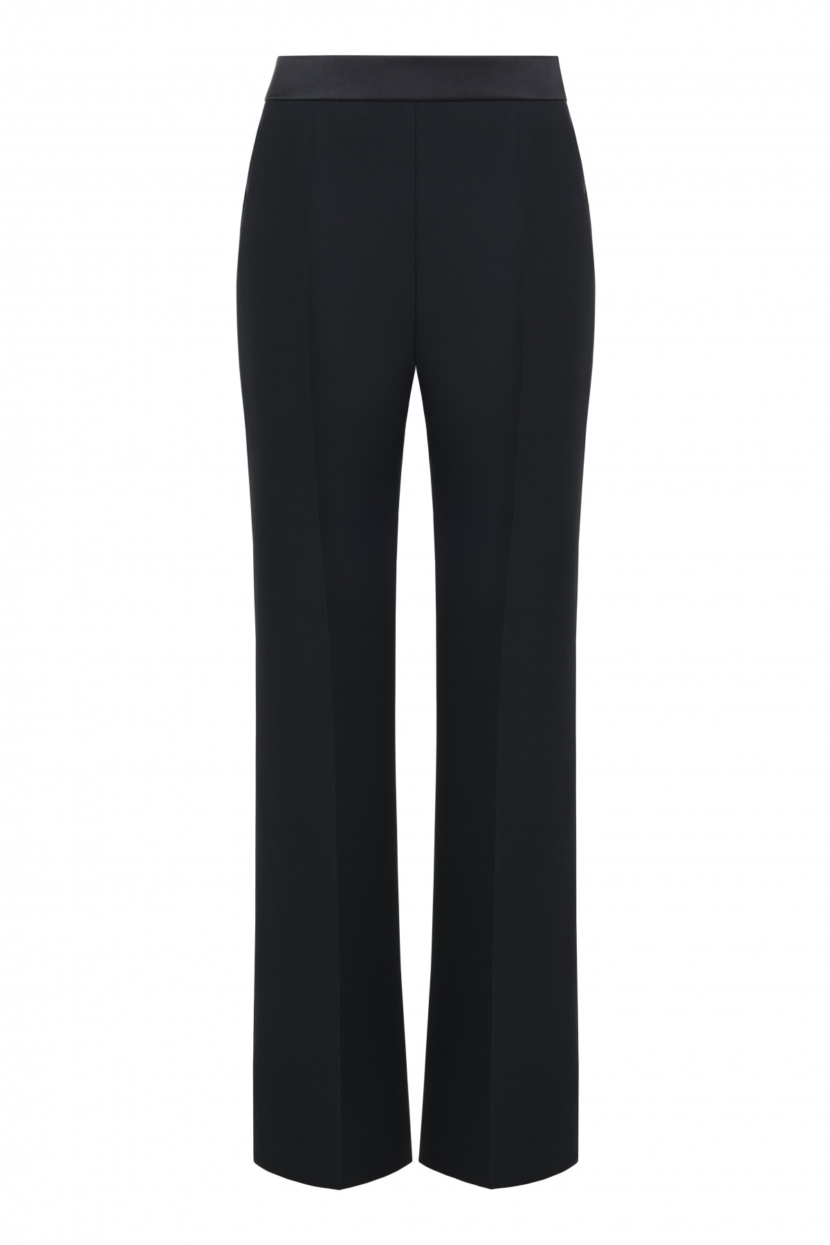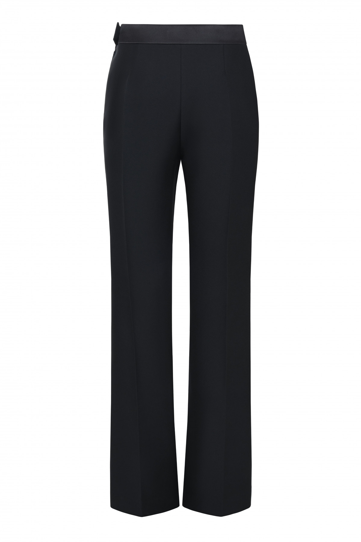 From the SS26 Collection, these black tailored trousers feature a sleek, elongated silhouette with precise tailoring. The high-waisted design and sharp front seams create a clean, refined look that enhances the leg line.