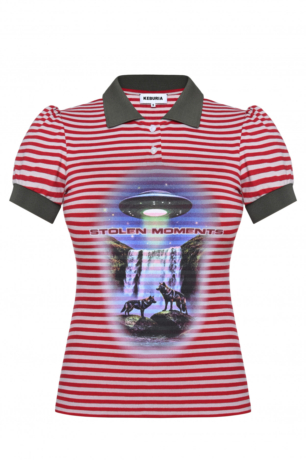 From the SS26 Collection, this striped polo tee merges classic sportswear codes with a graphic aesthetic. The fitted silhouette, contrast collar, and button placket maintain the timeless polo structure, while the central “Stolen Moments” graphic print creates a surreal narrative through layered imagery and visual contrast.